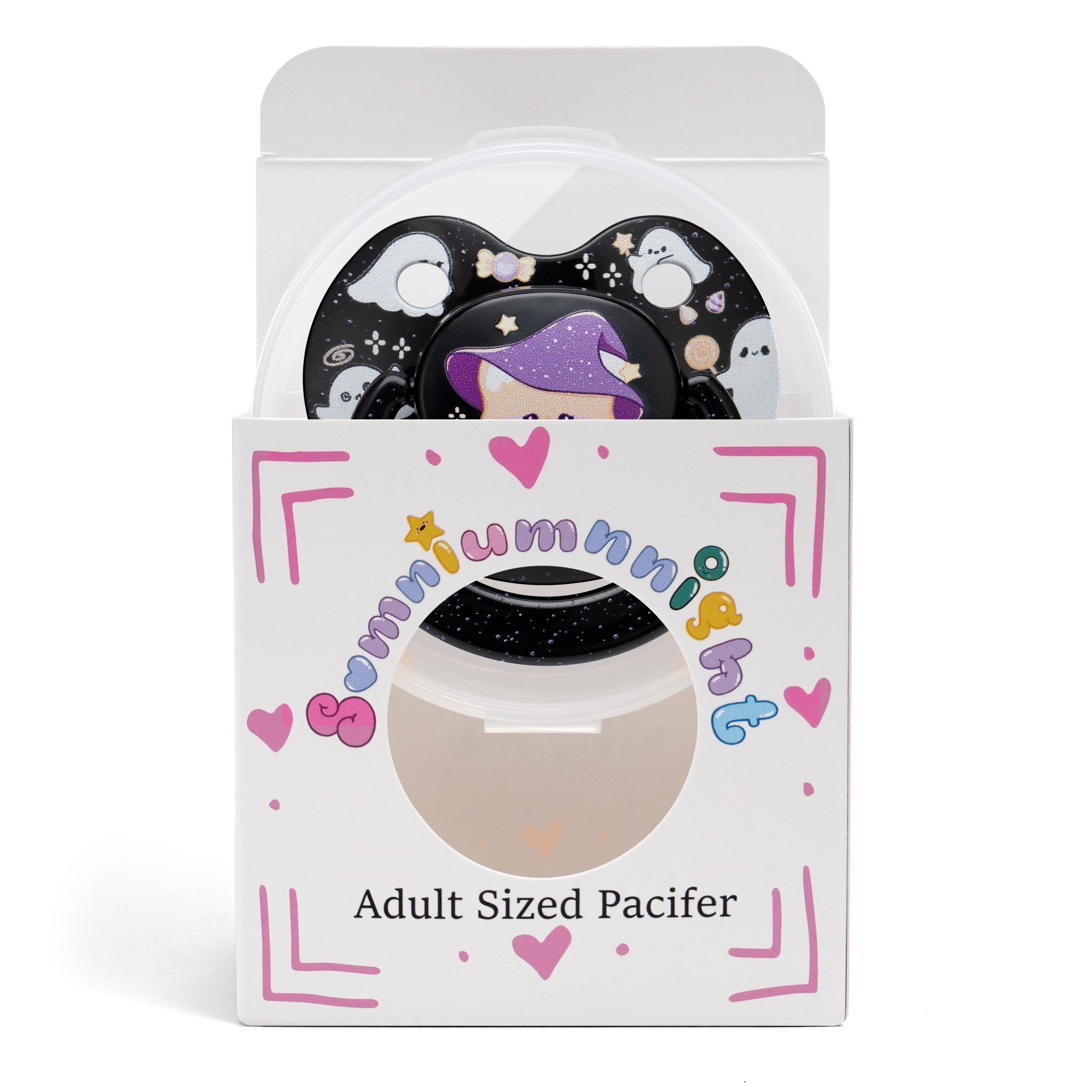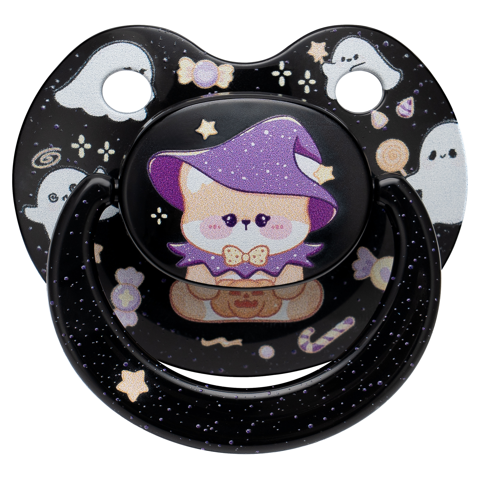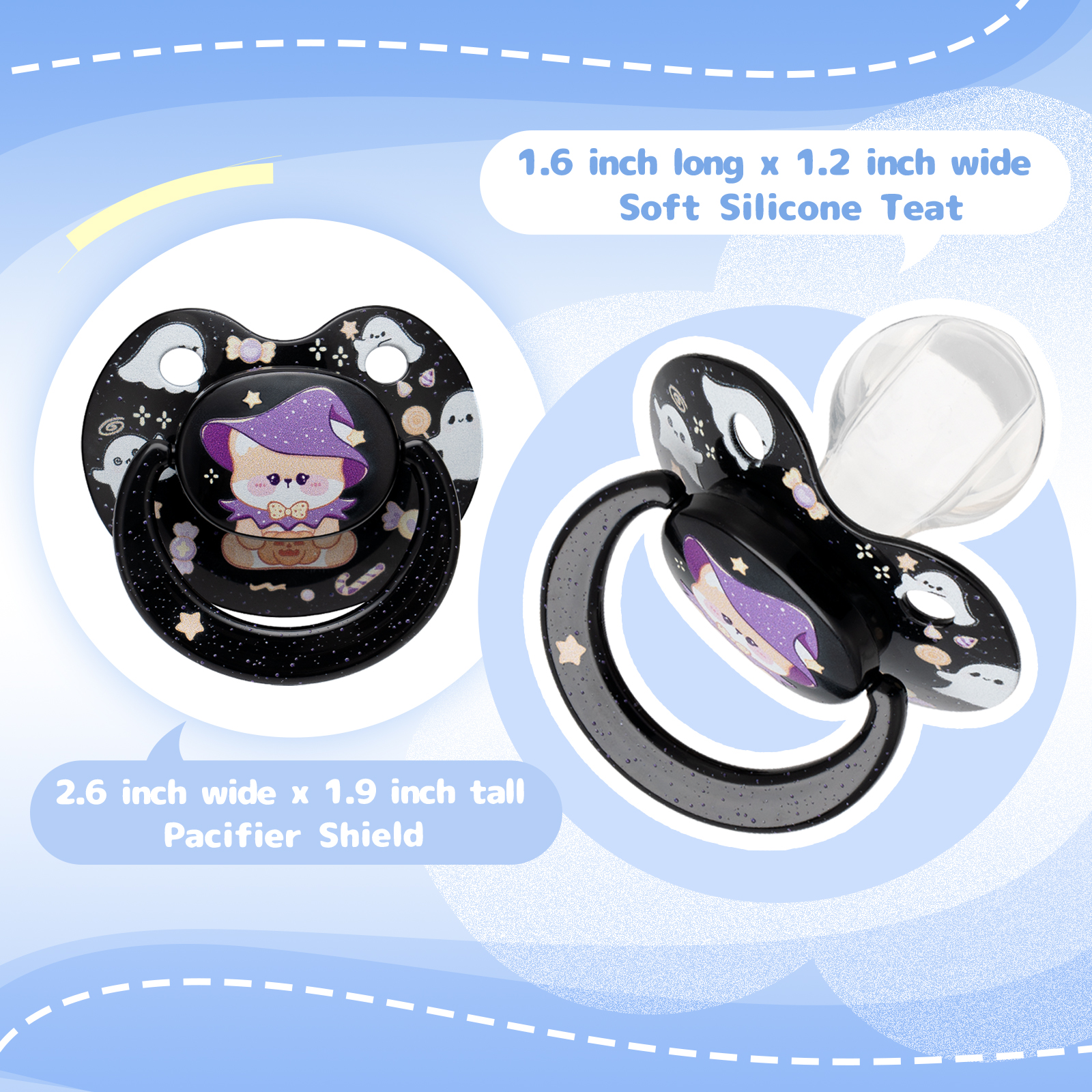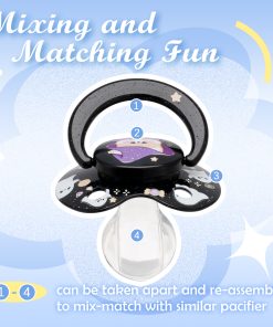 - Halloween-Themed Design: Adorned with cute cartoon images of magic bears, ghosts, and candy, this pacifier brings a playful and festive Halloween spirit. All parts are detachable and reassemblable, ensuring easy cleaning and hygiene.
