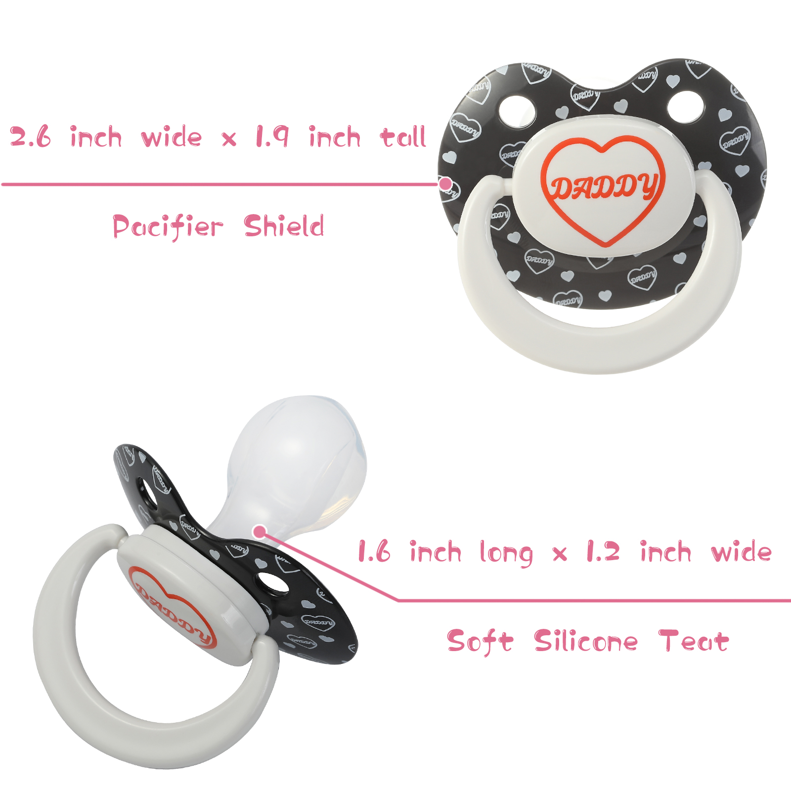 - 【Adult Sized Teat】Teat Size: 1.6 inch Long x 1.2 inch Wide; Pacifier Shield Size: 2.6 inch Wide x 1.9 inch Tall